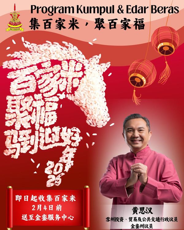 ஷா ஆலம், ஜன 12: சீனப் புத்தாண்டு கொண்டாட்டத்தின் ஒரு பகுதியாக ‘நூறு குடும்பங்களின் அரிசி சேகரிப்பு, நூறு ஆசீர்வாதங்கள் ஒன்றிணைப்பு’ (Kumpul Beras Seratus Keluarga, Himpun Seratus Keberkatan) என்ற திட்டத்தை கின்ராரா மாநில சட்டமன்ற உறுப்பினர் இங் ஸீ ஹான் தொடர்ந்து நடத்தி வருகிறார்.