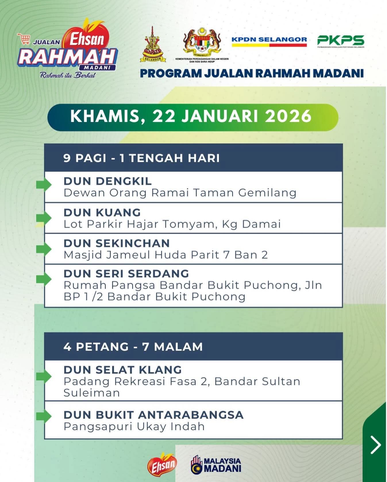 ஷா ஆலம், ஜன 22 : அரிசி, முட்டை போன்ற பல்வேறு அடிப்படை பொருட்களை மலிவு விலையில் விற்கும் ஜுவாலான் ஏஹ்சான் ரஹ்மா திட்டம் இன்று ஆறு இடங்களில் காலை 9 மணிக்கும் மாலை 4 மணிக்கும் நடைபெறும்.