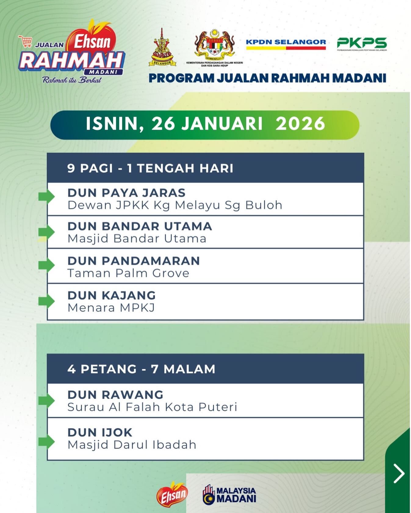 ஷா ஆலம், ஜன 26 : அரிசி, முட்டை போன்ற பல்வேறு அடிப்படை பொருட்களை மலிவு விலையில் விற்கும் ஜுவாலான் ஏஹ்சான் ரஹ்மா திட்டம் இன்று ஆறு இடங்களில் காலை 9 மணிக்கும் மாலை 4 மணிக்கும் நடைபெறும்.