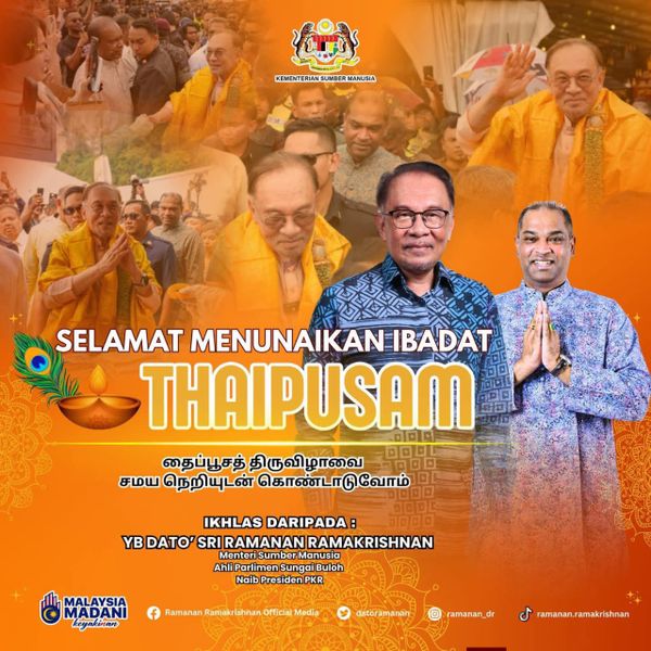 கோலாலம்பூர், ஜன 31 –நாடு முழுவதும் உற்சாகமாக கொண்டாடப்பட்டு வரும் தைப்பூசத் திருவிழாவை முன்னிட்டு, மலேசிய இந்துப் பெருமக்களுக்கு தனது மனமார்ந்த வாழ்த்துகளைத் தெரிவித்துக் கொண்டுள்ளார் மனிதவள அமைச்சரும் சுங்கை பூலோ நாடாளுமன்ற உறுப்பினருமான டத்தோ ரமணன் ராமகிருஷ்ணன்.