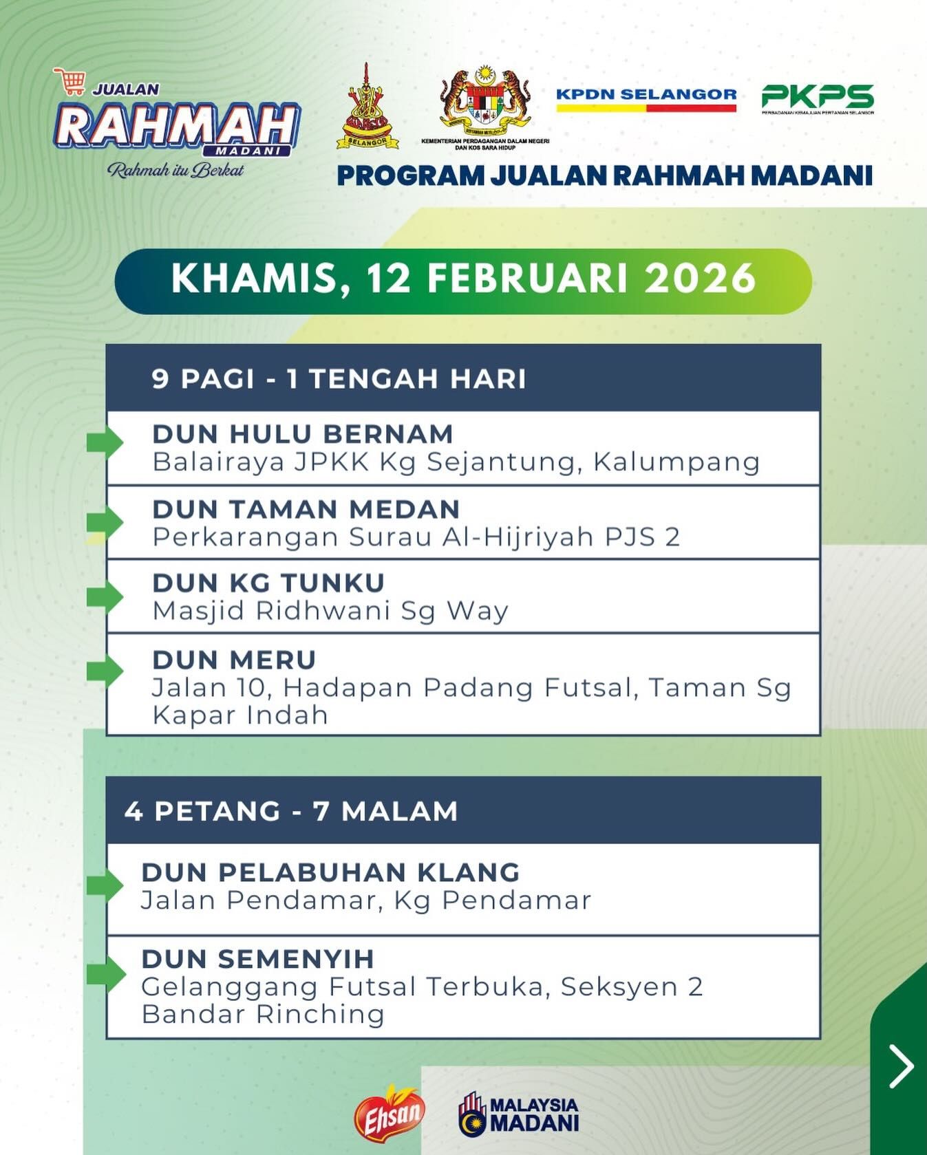 ஷா ஆலம், பிப் 12 : அரிசி, முட்டை போன்ற பல்வேறு அடிப்படை பொருட்களை மலிவு விலையில் விற்கும் ஜுவாலான் ஏஹ்சான் ரஹ்மா திட்டம் இன்று ஆறு இடங்களில் காலை 9 மணிக்கும் மாலை 4 மணிக்கும் நடைபெறும்.