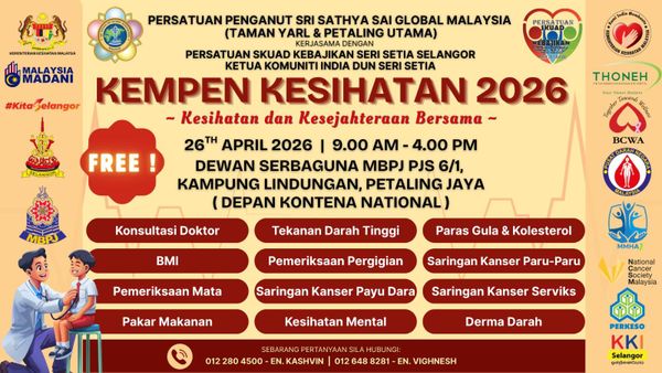 ஸ்ரீ சத்ய சாய் குளோபல் மலேசியா அமைப்பு (தாமான் யால் & பெட்டாலிங் உத்தாமா செண்டர்), ஸ்குவாட் கெபாஜிகான் ஶ்ரீ செத்தியா சிலாங்கூர் மற்றும் ஶ்ரீ செத்தியா இந்திய சமூகத் தலைவர் இணைந்து ஏற்பாடு செய்த இந்த முகாம், சமூக நலன் மற்றும் ஆரோக்கிய விழிப்புணர்வை உயர்த்தும் நோக்கில் நடைபெற்றது.