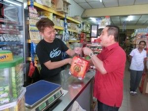 黄瑞林(右)向商家拜年,并送上黄梨饼和红包封。 [/caption]