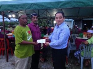 黄瑞林(右)移交500令吉支票给8号半沟祈祷室代表,南里。[/caption]