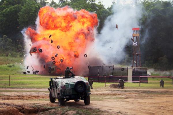 扛起保家卫国重担的军人正进行演习。