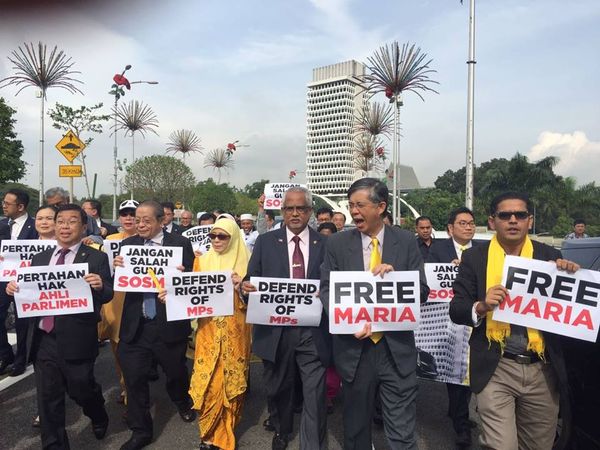 由反对党国会领袖拿督斯里旺阿兹莎领导的游行队伍,今早9时许手持横幅一路游行,要求警方释放在2012年国家安全罪行(特别措施)法令(SOSMA)下被扣的玛丽亚陈,同时要求各造尊重国会议员的发声权。