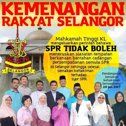 高庭也正式发出暂缓令,暂停选委会在雪州主办的所有重划选区听证会,截至2017年1月20日的案件聆审为止。