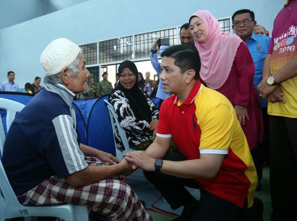 阿兹敏今午抵达沙白巴耶巴鲁民众会堂的疏散中心,慰问获安顿在该处的107名灾黎,同时移交各500令吉援助金给每户受灾家庭.