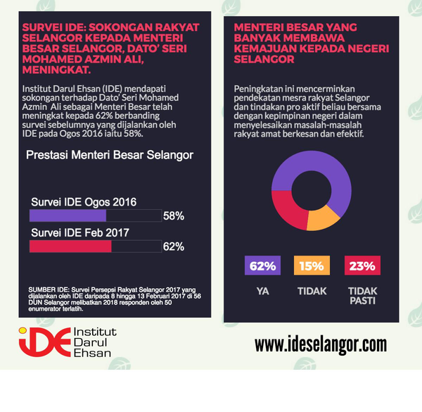 雪州智库达鲁益山研究所(IDE)副主席莫哈末礼端表示,这份以《2017年雪州人民印象》为主题的民调从2月8日至13日,在雪州56个州选区抽样访问2018名各族受访者,并得出这项结论。