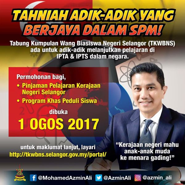 (莎阿南16日讯)2016年大马教育文凭考试今日放榜,雪州大臣拿督斯里阿兹敏阿里祝贺考获佳绩的学子,并趁机向即将深造的学子“推销”州政府所推出的高等教育援助计划。