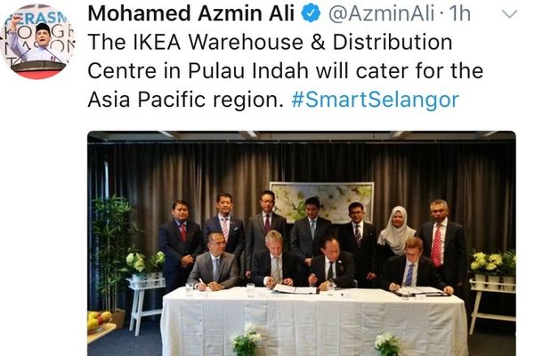 阿兹敏近日率领雪州政府代表团远赴瑞士巴塞尔,见证州政府子公司Central Spectrum 有限公司 (CSSB)与宜家签署相关合约后,8月24日在社交网站推特与民众分享这项好消息。