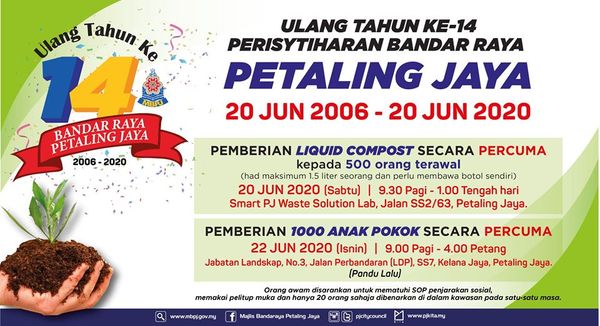 (莎阿南19日讯)八打灵再也市政厅配合升格14周年之喜定在6月20日和22日,免费送出液体堆肥和树苗给市民。