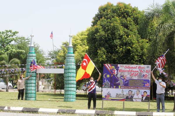 除了在交通圈空地的草场安置双峰塔外,服务团队也在周遭挂满小国旗,呈现象征国家五大原则的五角星,以及印有国父东姑阿都拉曼肖像的看板,近期也会装上印有辉煌条纹的灯笼。