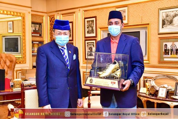 雪兰莪苏丹沙拉夫丁(左)接领由前国家足球队射脚卡立赞鲁斯所出售的金靴奖杯。[/caption]