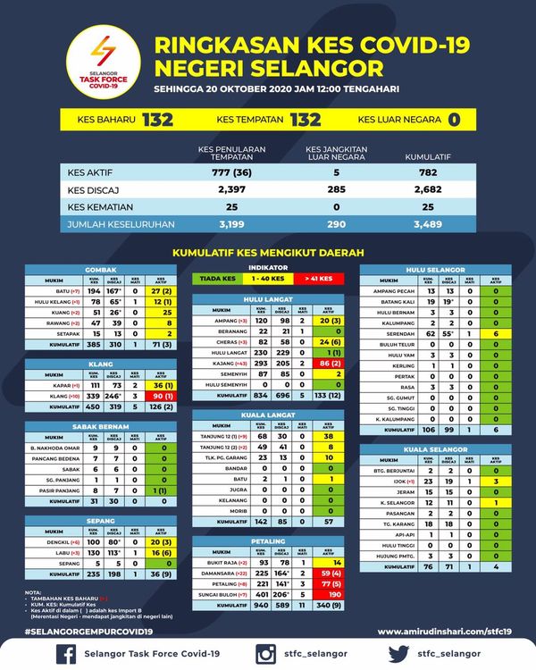 雪州新冠肺炎抗疫特工队表示,随着10月20日新增的132宗确诊病例,雪州目前共累计3489宗新冠肺炎确诊病例。