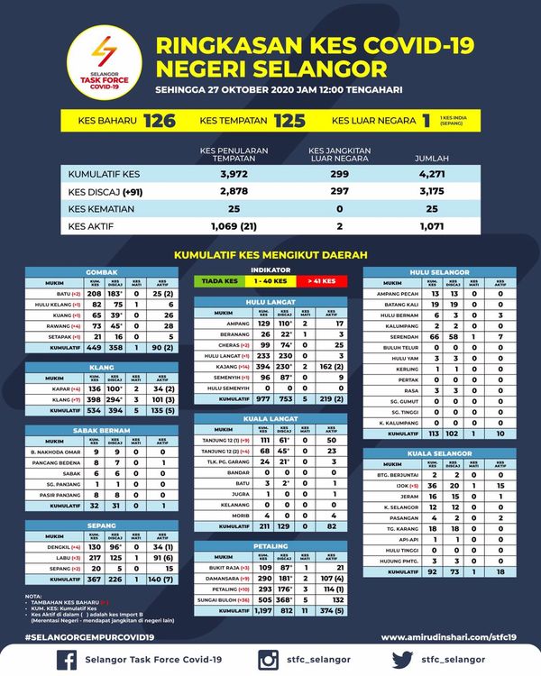 雪州在10月27日单日新增126宗冠病确诊病例,其中59宗来自现有的感染群、42宗来自患者的密切接触者筛检、24宗来自现场筛检,以及1宗境外输入病例。