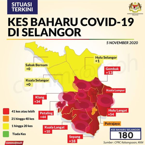 根据雪州卫生局公布的数据,雪兰莪在今日新增的180宗确诊病例中,以乌鲁冷岳县激增54宗居首;鹅麦县共14宗、巴生县36宗、雪邦县18宗、瓜拉冷岳10宗、八打灵县44宗、乌鲁雪兰莪县1宗。