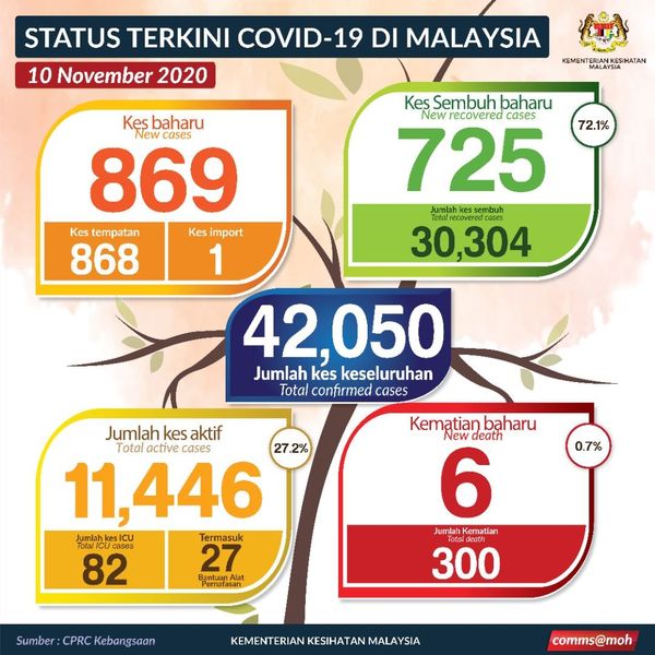 卫生总监丹斯里诺希山11月10日在疫情汇报会上说,我国今日截至中午12时新增869宗新冠肺炎确诊病例,累计的确诊病例达4万2050宗,其中1万1446宗是活跃病例。
