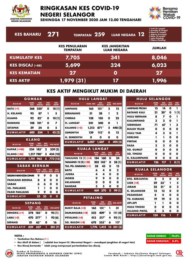 (莎阿南17日讯)雪兰莪截至今日中午12时新增271宗新冠肺炎确诊病例,其中巴生县激增189宗确诊病例。