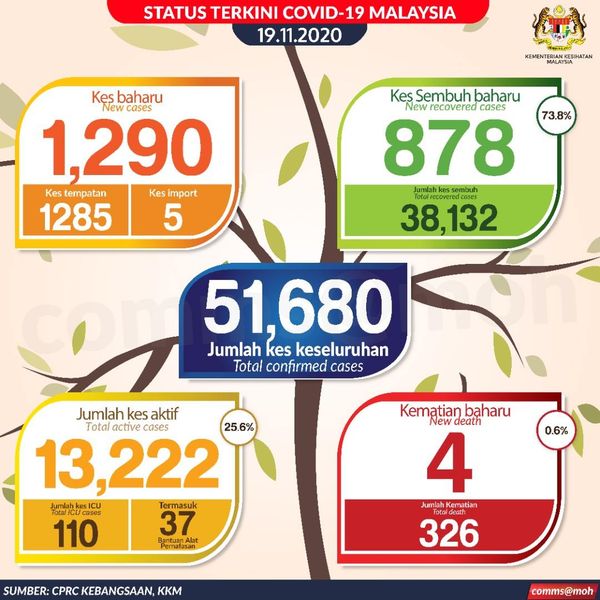 卫生总监丹斯里诺希山11月19日在文告中说,在1290宗新增的确诊病例中,1285宗是本土感染,5宗是境外输入病例。