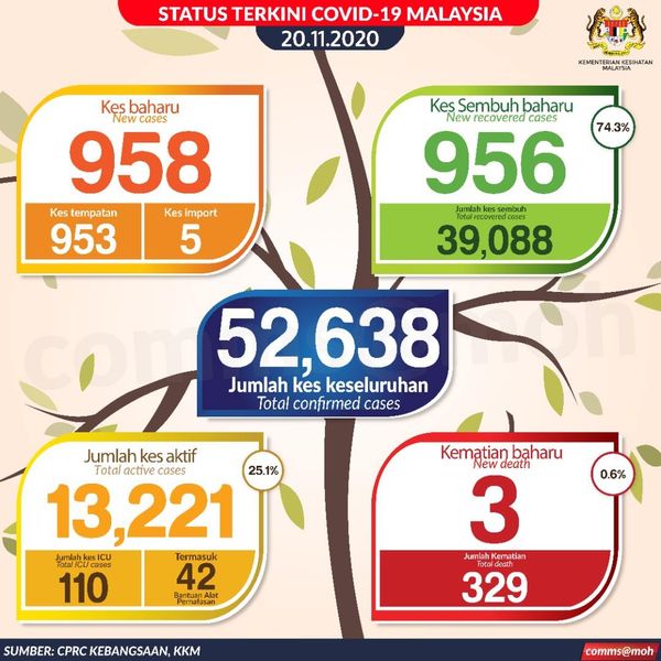 卫生总监丹斯里诺希山11月20日在疫情汇报会上表示,截至今日中午12时,我国今日新增958确诊病例,其中953宗是本土感染病例,5宗是境外输入病例。