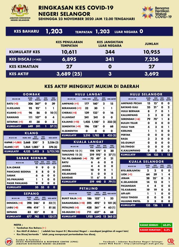 另一方面,根据雪州卫生局的数据显示,雪州各县的新增确诊病例分别是:巴生县1122宗、鹅麦县4宗、雪邦县13宗、乌鲁冷岳县28宗、瓜拉冷岳县4宗、八打灵县25宗、乌鲁冷岳县6宗、瓜拉雪兰莪县1宗。