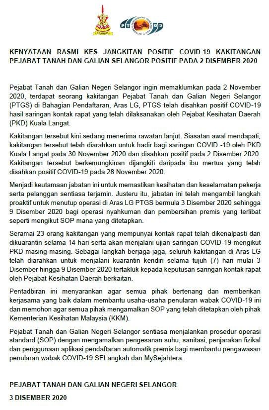 雪州土地及矿物局今日发表文告表示,有关确诊职员任职于当局的服务柜台,由于其岳母于11月28日确诊,他在11月30日按照瓜拉冷岳县卫生局的指示接受新型冠状病毒筛检。