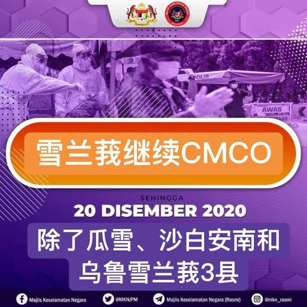 由于雪州的新冠肺炎确诊病例不断上升,政府从10月14日起对全雪州实施有条件行动管制令,原地的管制令至12月6日。