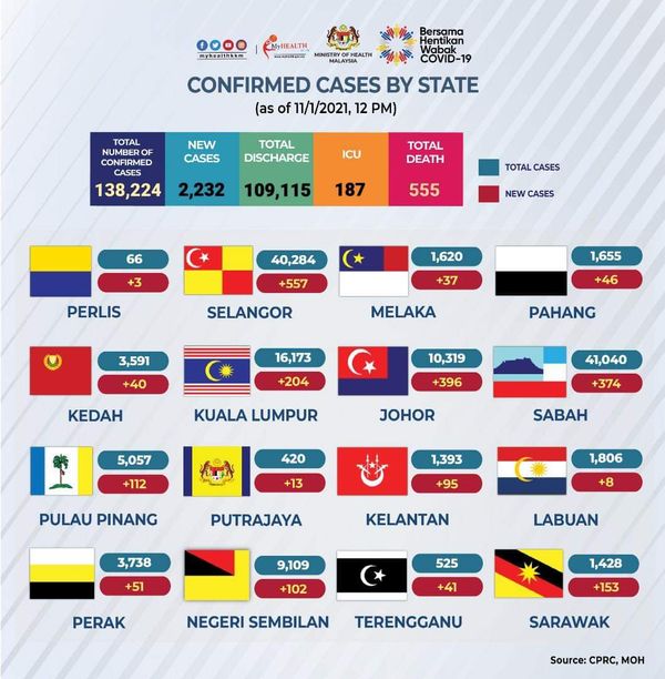 卫生总监丹斯里诺希山1月11日发表文告汇报疫情说,当中有6宗为境外输入,累计病例为13万8224宗,活跃案列有2万8554宗。