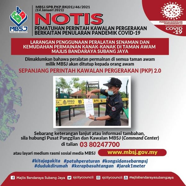 (莎阿南15日讯)梳邦再也市政厅(MBSJ)在行动管制令期间,禁止市民使用辖内公共公园的运动设施及儿童游乐场。