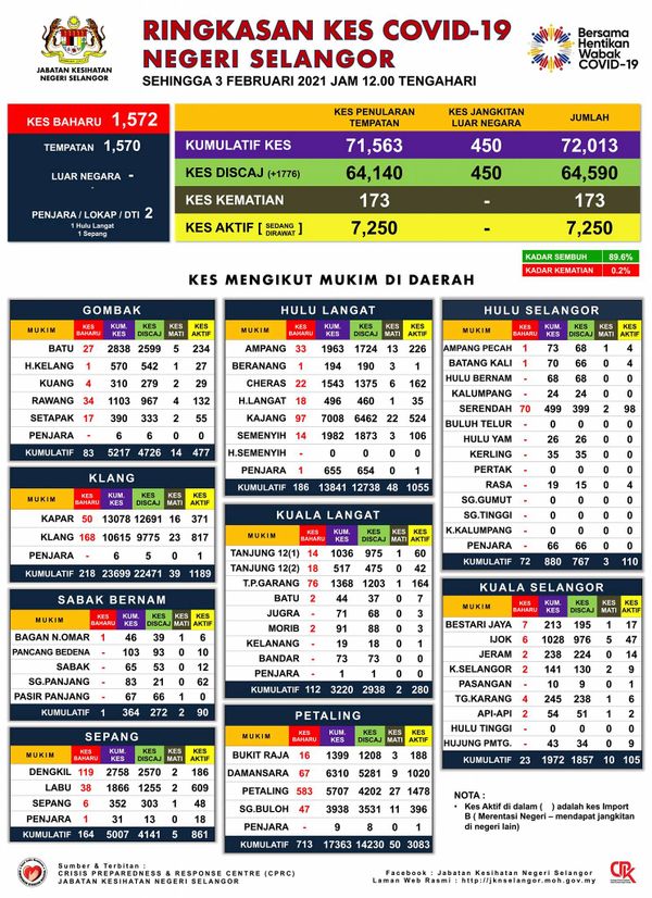 雪州今日有1776人痊愈出院,累计的痊愈病例共6万4590宗,目前的活跃病例为7250宗。