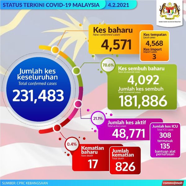 卫生总监丹斯里诺希希山2月4日发表文告指出,当中有4568宗为本地案例,3宗境外输入,活跃发病累计至23万1483宗。