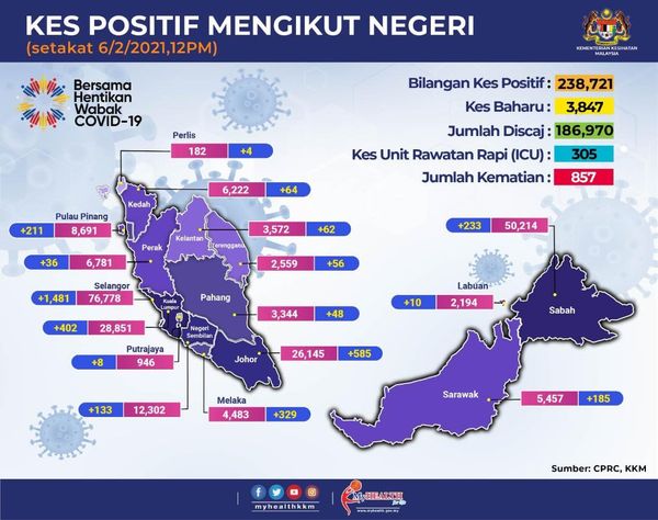 此外,他说,雪兰莪依旧是增加最多病例的州,今日新增1481宗,接着是柔佛585宗及吉隆坡402宗。