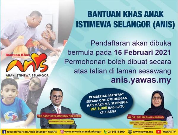 (莎阿南14日讯)由雪兰莪州政府推出的“雪州特殊孩童援助”(AnIS),从明日(15日)起开放让家长上网申请。