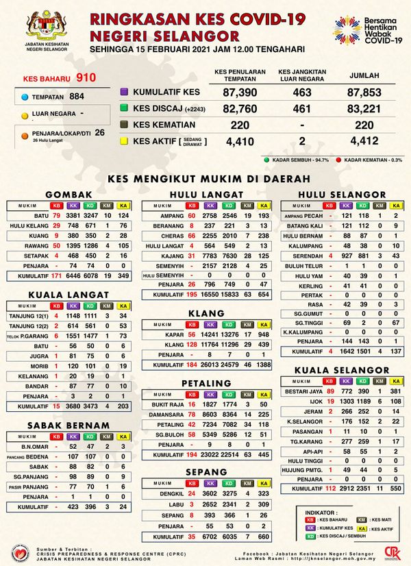 卫生总监丹斯里诺希山2月15日在文告中说,全马今日新增2176宗确诊病例,其中910宗(41.8%)来自雪兰莪,当中724宗来自现有感染群密切接触者筛检。