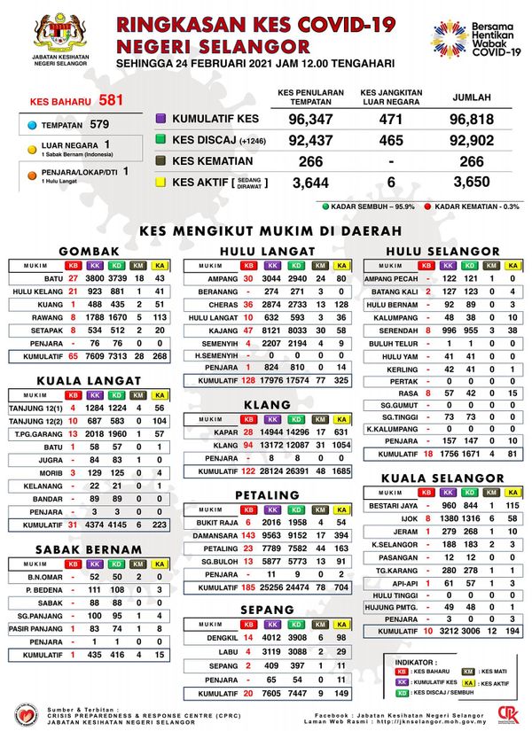 (莎阿南24日讯)雪兰莪新冠肺炎确诊病降低,今日只有581宗,其中一宗为境外输入,以及一宗监狱押留所病例。