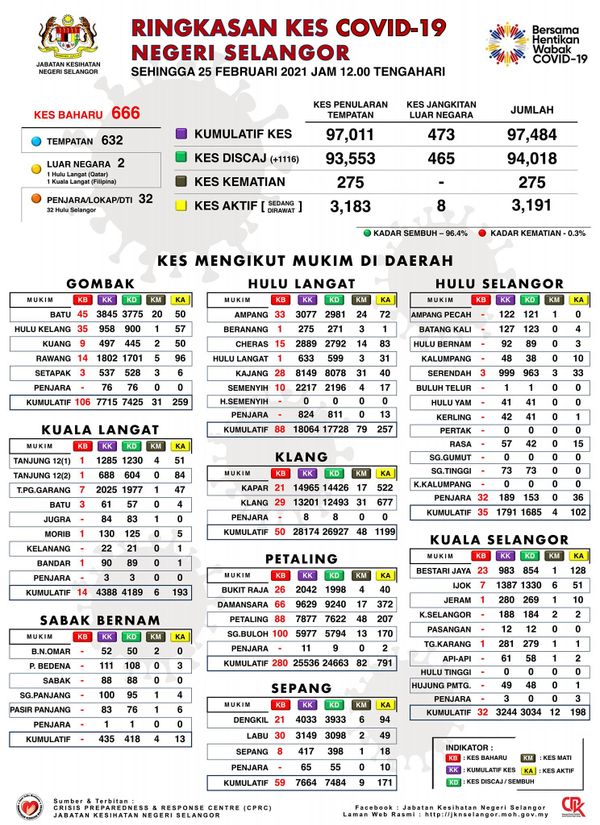 此外,据雪州卫生局公布的数据,雪州今增666宗病例,其中2宗为境外输入,以及32宗来自监狱或扣留所,截至目前累计病例为9万7484宗。