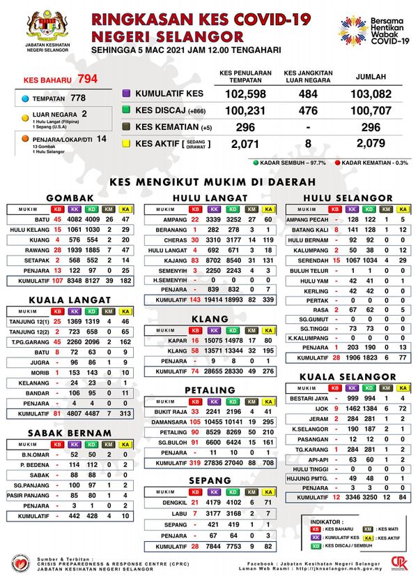 卫生总监丹斯里诺希山3月5日发文告指出,全马今日新增2154宗确诊病例及6宗死忙病例,雪州占794宗( 36.9%)。
