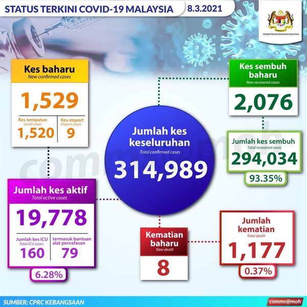卫生总监丹斯里诺希山3月8日发文告指出,我国今日新增1529宗病例,其中9宗为境外输入,累计确诊病例达31万4989宗。