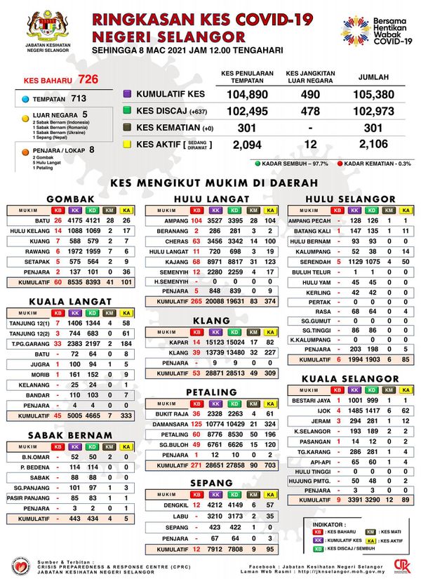 卫生总监丹斯里诺希山3月8日发文告指出,全马今日新增1529宗确诊病例,雪州最高,占726宗(47.5%)。