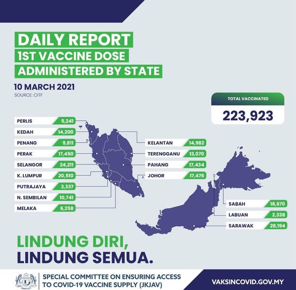 据生总监丹斯里诺希山3月11日在脸书发布的数据显示,首阶段全国新冠疫苗接种计划截至昨日,已有22万3923人接种第一剂疫。