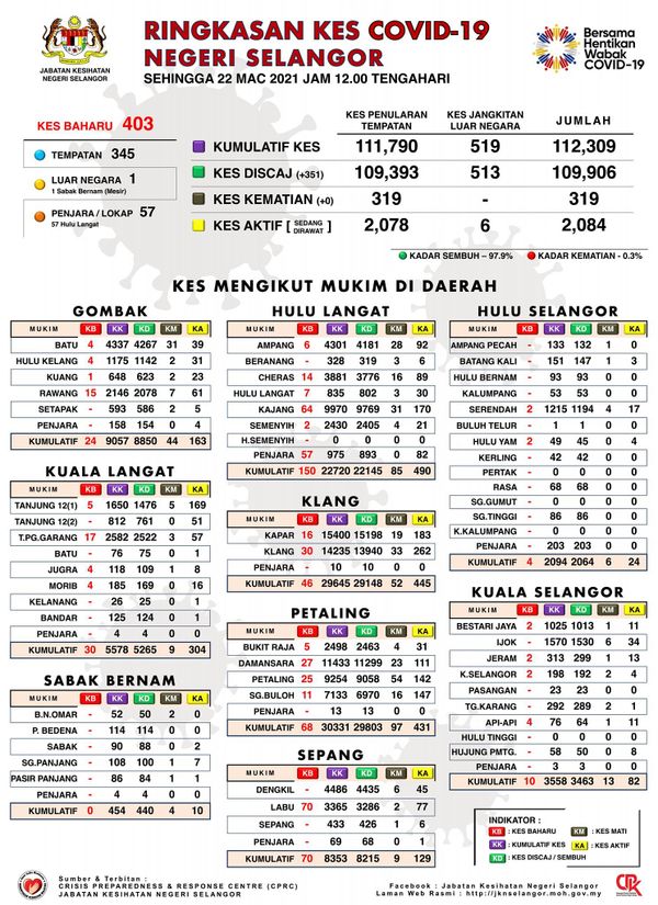 卫生总监丹斯里诺希山3月22日发文告指出,全马今日新增1116宗确诊病例及5宗死忙病例,雪州有403宗( 36.1%),是最多的州属。