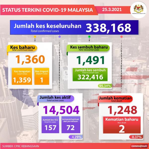 卫生总监丹斯里诺希山3月25日发文告指出,我国今日新增1360宗病例,其中1宗为境外输入,累计确诊病例达33万8138宗。