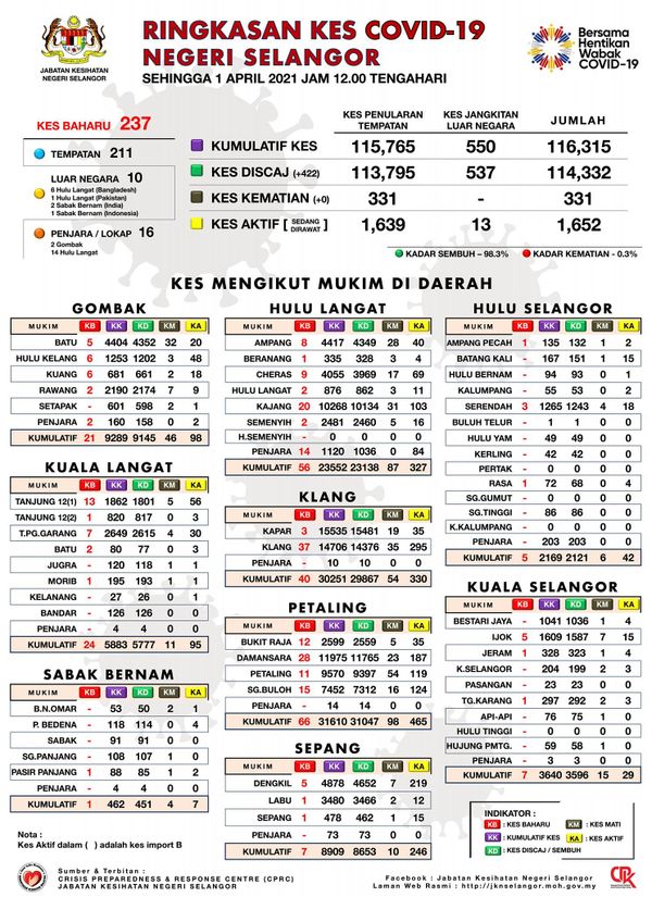 雪州卫生局4月1日在官方脸书发布数据图说明,我国今日新增1178宗病例,雪州是第二高,占237宗,州内累计确诊病例达11万6315宗。