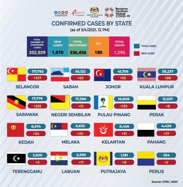 卫生总监丹斯里诺希山4月5日发文告指出,我国截至中午12时,增1070宗病例,其中1061宗为公民,以及9宗为境外输入,累计确诊病例有35万2029宗。