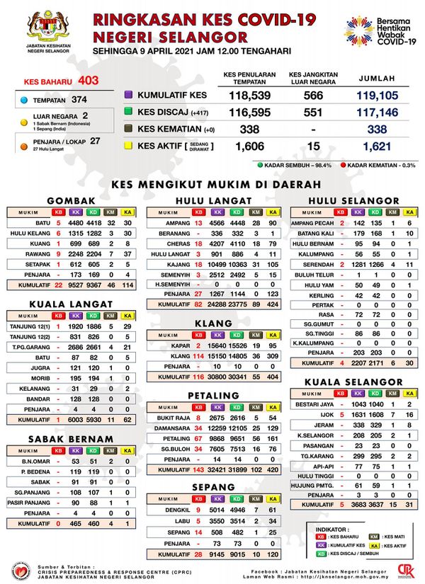 据雪州卫生局4月9日发布的冠病数据图,州内今日有417人痊愈出院,累计痊愈病例共有11万7146宗,活跃病例有1621宗。
