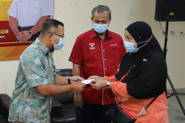 阿米鲁丁4月26日在雪邦县举行的雪州斋戒月巡回活动中,于瑟罗扎花园民众会堂移交这笔风灾援助金给受惠的家庭。