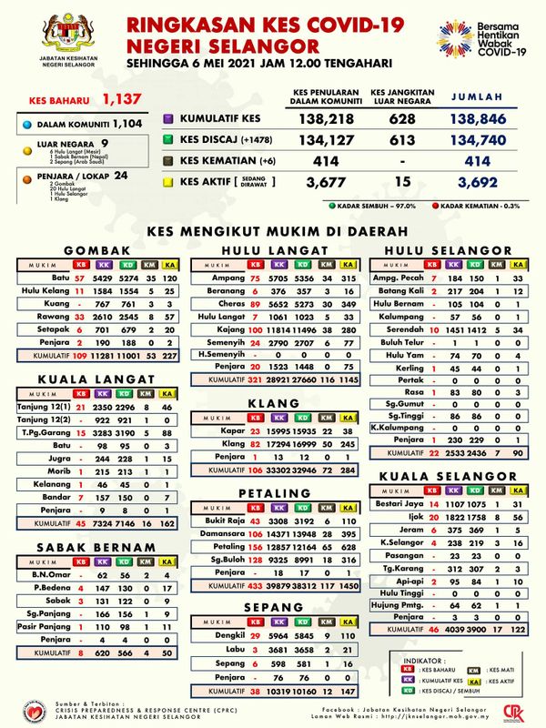 据雪州卫生局5月6日在脸书公布的数据显示,雪州今日有1478人痊愈出院,累计痊愈病例13万4740宗,目前活跃病例有3692宗。