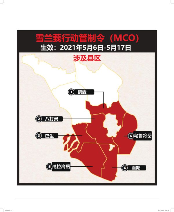雪兰莪6县从5月6日至17日重新实施行动管制令,包括:乌鲁冷岳县、八打灵县、巴生县、鹅麦县、雪邦县和瓜拉冷岳县,以遏制新冠肺炎疫情持续恶化。