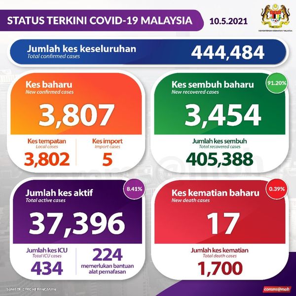 卫生总监丹斯里诺希山5月10日发文告指出,今日新增3807宗确诊病例中,有5宗为境外输入,3802宗为本土病例。累计活跃病例达3万7396宗。